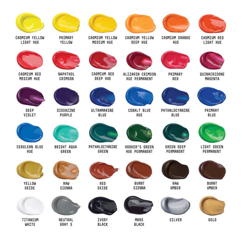 • Contents: 36 x 22ml tubes. This set contains 36 colors in .75 oz (22 ml) tubes, including Alizarin Crimson Hue, Burnt Sienna, Burnt Umber, Cadmium Orange Hue, Dioxazine Purple, Ivory Black, Light Green Permanent, Phthalo Green, Primary Blue, Primary Red, Primary Yellow, Titanium White, Cadmium Red Light Hue, Cadmium Yellow Medium Hue, Cerulean Blue Hue, Cobalt Blue Hue, Hooker’s Green Hue Permanent, Phthalo Blue, Quinacridone Magenta, Raw Sienna, Raw Umber, Red Oxide, Ultramarine Blue, Yellow Oxide, Bright Aqua Green, Cadmium Red Deep Hue, Cadmium Red Medium Hue, Cadmium Yellow Deep Hue, Cadmium Yellow Light Hue, Deep Green Permanent, Deep Violet, Gold, Neutral Gray Value 5, Silver, Naphthol Crimson, and Mars Black